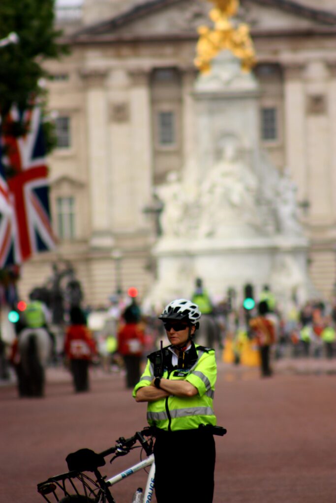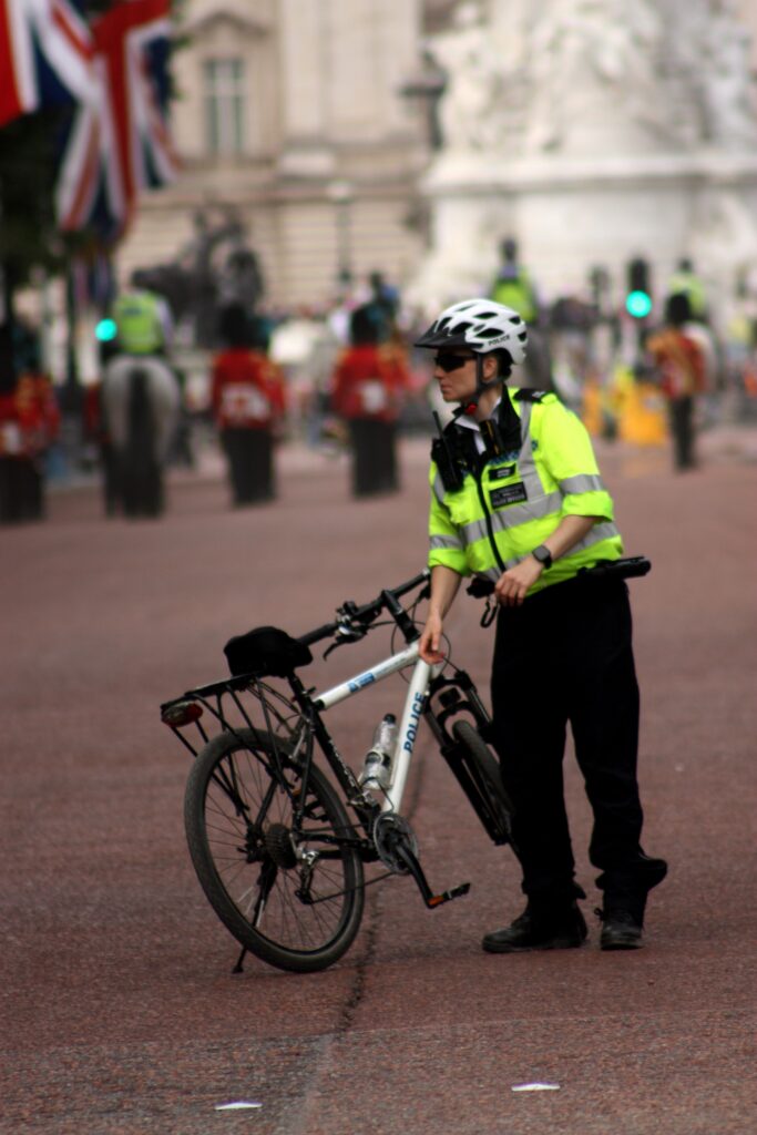 Le parallèle entre les gardes royaux, fusils à baïonnette à la main, et le policier municipal à vélo, peut-être ?